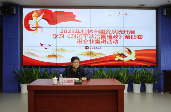 11月23日,,,,桂林市国资委党委委员、副主任赵祖俊到集团公司开展党课宣讲,,,,向企业党员干部职工宣讲《习近平谈治国理政》第四卷精神要义,,,,并对下层企业刷新生长举行指导。。。。集团公司党委副书记刘波及向导班子、集团公司总部全体党员、各成员单位党员干部职工代表等加入学习。。。。