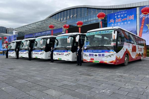 2021年中国—东盟展览会、东盟展览会旅游展准期举行,,鼎翔旅游为旅游展提供了由6辆新能源大巴组成的礼宾车队,,为展览提供高品质出行效劳。。。
