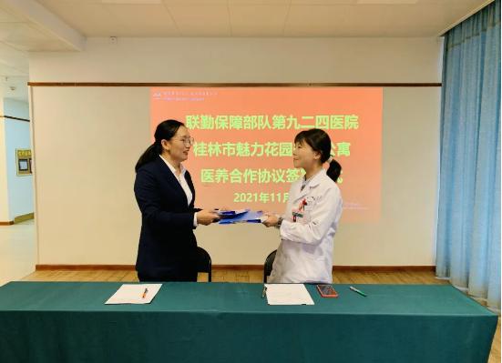 为增进医养连系生长,,,,日前魅力花园(桂林交控)国际养老公寓与中国人民解放军联勤包管步队第九二四医院签署了《效劳住民恒久义诊运动协议书》,,,,以后第九二四医院将为魅力花园养老公寓晚年人开通就诊绿色通道,,,,并未必期为魅力花园老人们开展慢病诊治、照顾护士指导、重症转诊、疾病防控和宣教等专家惠民医疗效劳。。。。。