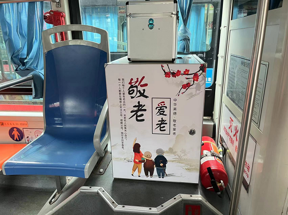 敬老爱老公交专线车厢内知心的设置了应急医药箱,,,安排了速效救心丸、跌打损伤药、创口贴、纱布等晚年人常用药物物资,,,利便旅客应急情形使用,,,全方位呵护旅客的清静。。。。