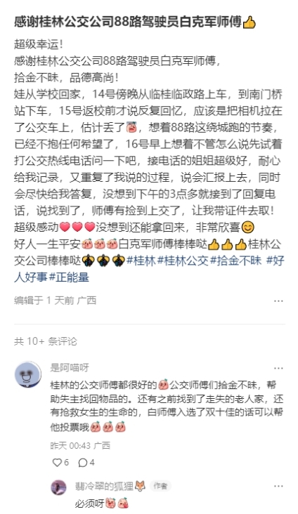 ÊÂÇéÒª´Ó12 ÔÂÖÐÑ®µÄÒ»Ìì»Æ»èÌá¼°¡£¡£¡£¡£½¯Å®Ê¿µÄº¢×Ó´ÓÁÙ¹ðÁÙÕþ·³Ë×ø88·¹«½»³µ£¬£¬ÔÚÄÏÃÅÇÅվϳµÊ±Ê§É÷½«Ïà»úÒÅÂäÔÚ³µÉÏ¡£¡£¡£¡£ÊÂÇ鱬·¢ºó£¬£¬½¯Å®Ê¿±§×ÅÊÔÊÔ¿´µÄÐÄ̬²¦´òÁ˹«½»ÈÈÏߣ¬£¬ÊÂÇéÖ°Ô±ÈÈÇé½Ó´ý²¢Ïêϸ¼Í¼ÁËÏà¹ØÐÅÏ¢¡£¡£¡£¡£µ±ÌìÏÂÖ磬£¬½¯Å®Ê¿¾Í½Óµ½Á˹ðÁÖ¹«½»ÊÂÇéÖ°Ô±µÄµç»°£¬£¬ËµÏà»úÒÑÕÒµ½¡£¡£¡£¡£ÔÀ´£¬£¬88·¹«½»³µ¼ÝʻԱ°×¿ËÖÇÄÒ¸µÔÚ³µÁ¾»Ø³¡¼ì²éʱ·¢Ã÷ÁË×ùÒÎÉϵÄÏà»ú°ü¼°ÄÚÀïµÄµ¥·´Ïà»ú£¬£¬ËæºóʵʱÉϽ»¼ÓÈëÕ¾ÖÎÀíÖ°Ô±´¦±£¹Ü¡£¡£¡£¡£Ïà»úʧ¶ø¸´µÃÈý¯Å®Ê¿ºÜ¸ÐÉË£¬£¬ÓÚÊÇÔÚ¡°Ð¡ºìÊ顱дÏÂÁ˶Թ«½»³µÊ¦¸µµÄÔÞÃÀºÍлл¡£¡£¡£¡£